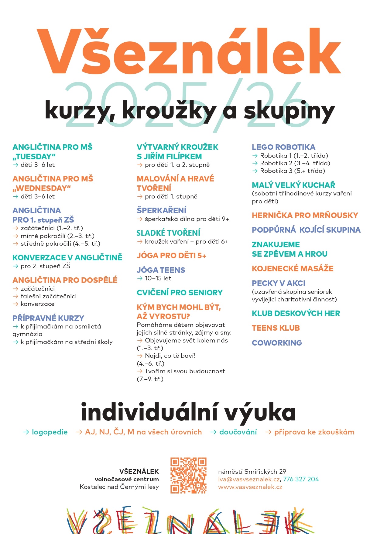 Zahajujeme přihlašování do kurzů a kroužků na nastávající školní rok. Prostudujte si nabídku a najděte si pro sebe anebo své dítě ten pravý.