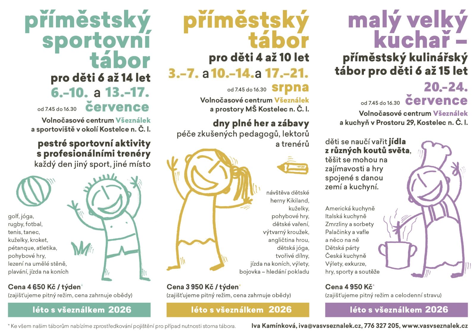 Mají tři různá zaměření – všeobecné, sportovní a kulinářské – a tak mezi nimi jistě naleznete ten svůj. Konají se v Kostelci a na nejzajímavějších místech jeho okolí. Všeználkovy tábory jsou zábavné, zajímavé, akční, ale zároveň bezpečné a pod vedením zkušených vedoucích. Přihlášky a další detaily zde.